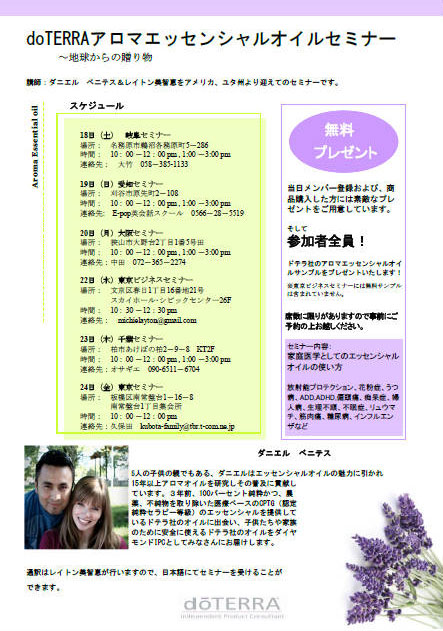 doTERRA製品の説明とビジネスに関する説明会が日本国内4ヶ所で開催されます。doTERRA製品、ビジネスにご関心のおありのお客様は、ぜひお近くの説明会にご参加ください。